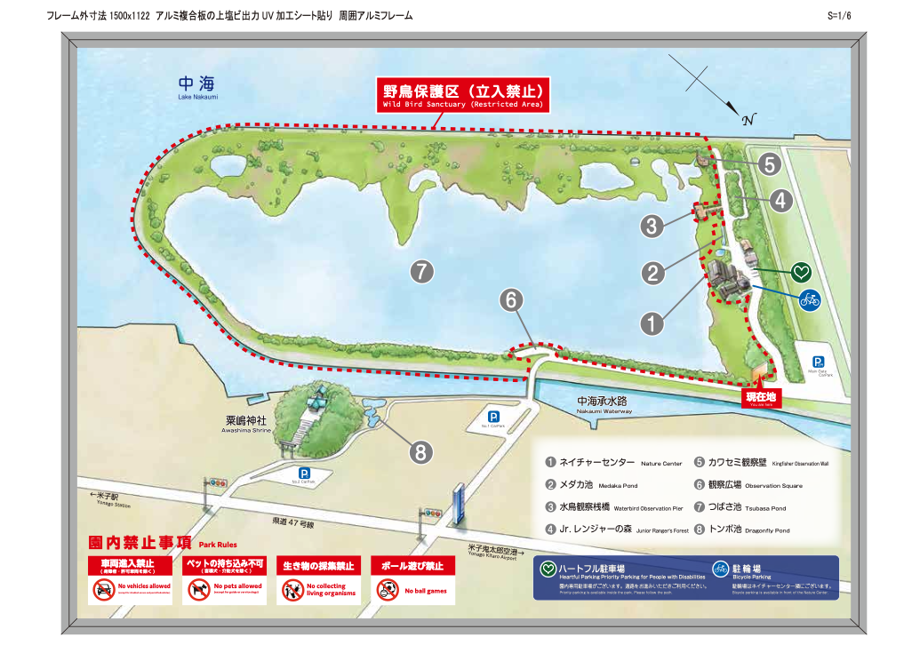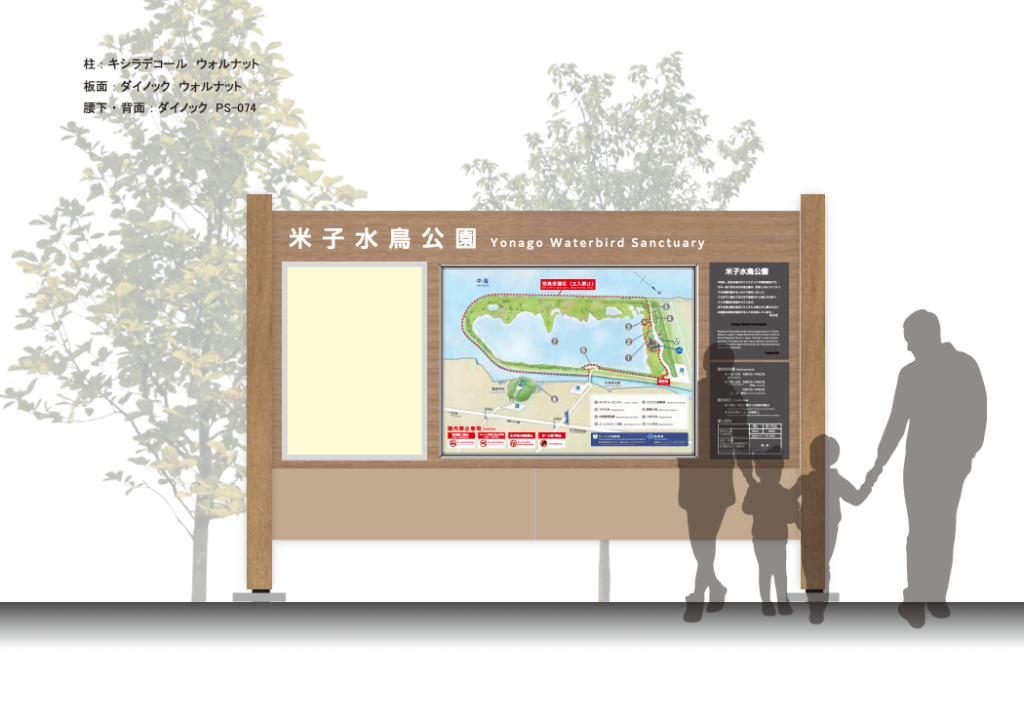 同様の仕様で、正門前総合案内板、施設前水鳥解説板、駐車場案内板を作成した。